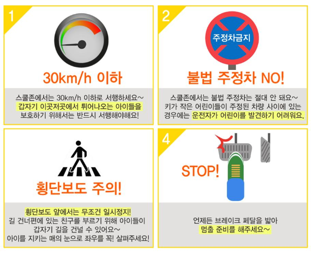 스쿨존과 마찬가지로 자동차 제한 속도 30Km/h 또는 50Km/h 이내로 주행 해야 하고, 주정차를 금지하며 신호·지시 위반, 통행금지·제한 위반, 주·정차 위반, 보행자 보호·속도위반 등 교통 법규를 어긴 경우에도 벌금과 벌점 모두 많게는 두 배까지 부과됩니다.