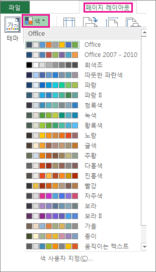 상단 메뉴 [페이지레이아웃] - [테마] - [색] 에서 설정을 변경하시면 됩니다.
