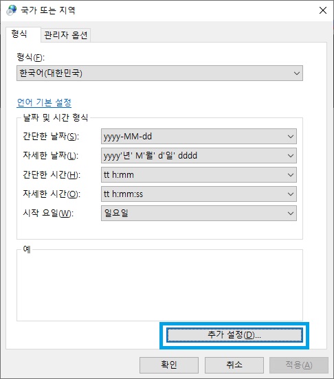 지역 - (우측 하단 관련 설정) 추가 날짜, 시간 및 국가별 설정