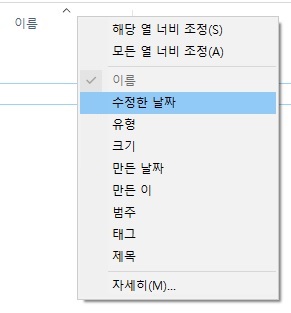 상단 열이름 (아래 그림에서는 이름이 있는 부분) 마우스 오른쪽 클릭 - 수정한 날짜 체크