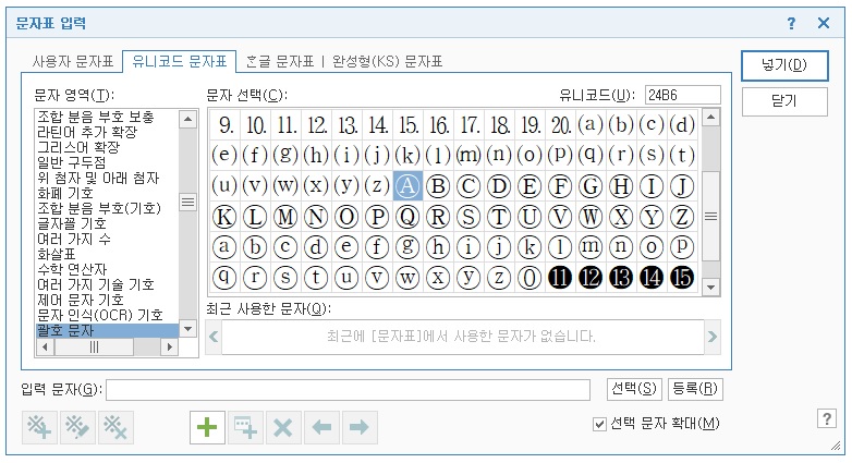 유니코드 문자표 탭의 괄호 문자 선택