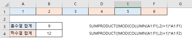 짝수행 (MOD(ROW(A1:F1),2)=0) 수식의 조건이 참(TRUE, 1)인 값의 범위만 계산합니다
