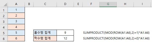 홀수행 (MOD(ROW(A1:F1),2)=1) 수식의 조건이 참(TRUE, 1)인 값의 범위만 계산합니다